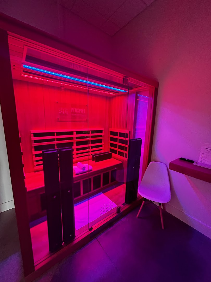 A modern sauna studio offering private infrared and red light therapy rooms with clean, tech-enhanced spaces and towel service for total wellness.