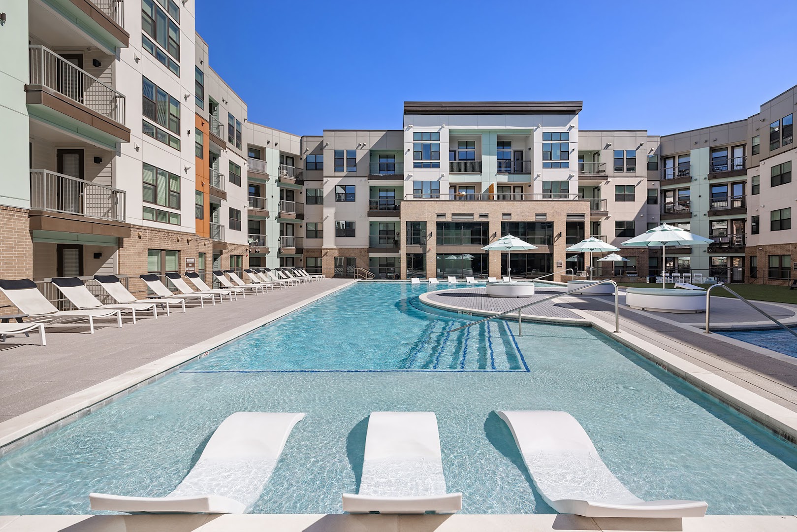Apartment complex in Lone Tree, Colorado offering amenities like fitness center, pool, and in-unit washer/dryer with on-site parking.
