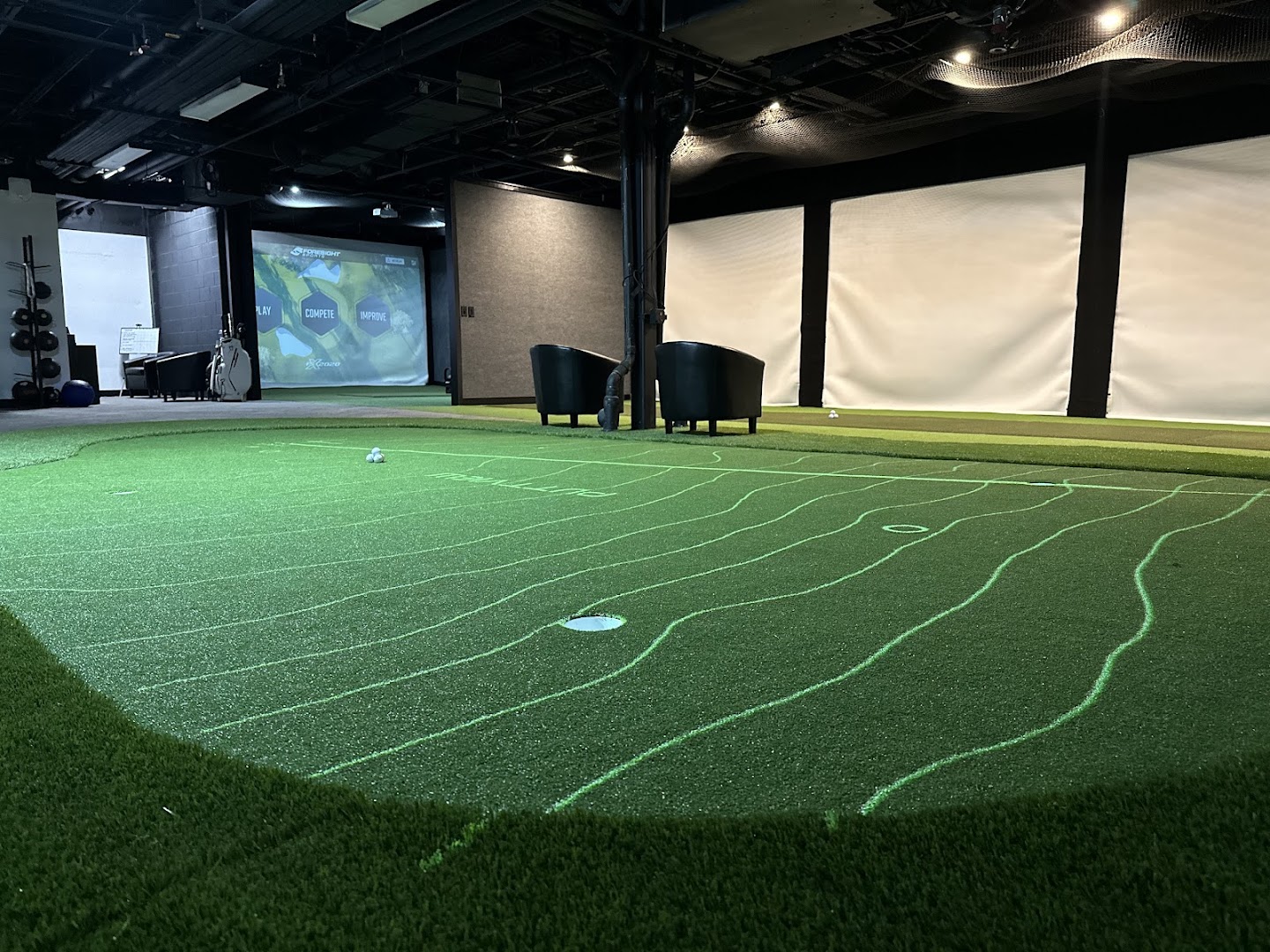 Indoor golf facility in Lone Tree, CO with advanced simulators, lessons, and recreational amenities including ping pong and pool tables.